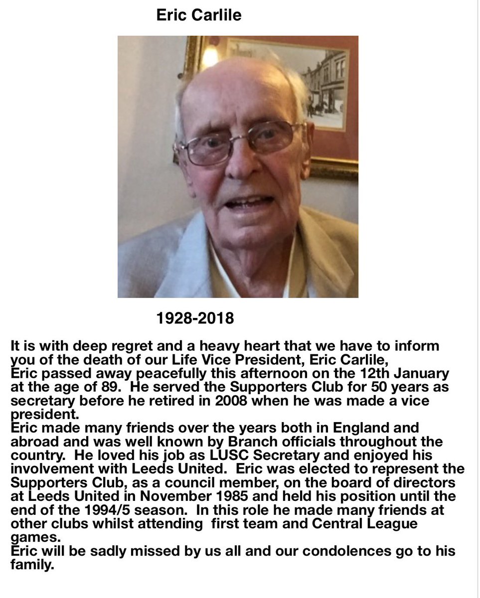 En av de største ildsjelene og en meget stor venn av skandinaviske Leeds supportere - tidligere sekretær i LUSC - Eric Carlile er død i en alder av 89 år. Han var sekretær i 50 år og vil tro at det er flere enn meg som fikk tilsendt kamp programmer og ordnet billetter av han personlig på 1980 og 1990 tallet. Det var stort å få de brune konvoluttene med Leeds programmer. En sjeldent flott fyr. Hvil i fred - synd du ikke fikk oppleve en skikkelig opptur igjen. Det hadde du fortjent.