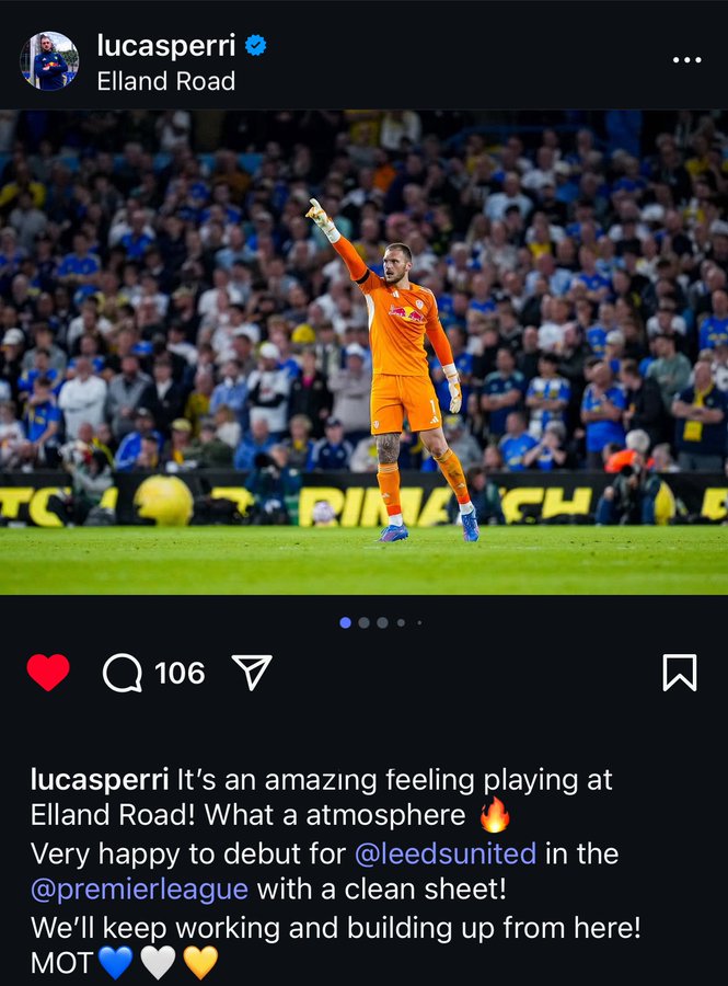 Quote from: Andersen on August 19, 2025, 15:01:40Perri hadde vel stort sett ingenting å gjøre i 1 omg av kampen i går kveld . Noe mer da Everton kom mer med i 2 omg. Hadde vel en redning på et skudd som han slo til corner, utover det var Everton svake. Perri virket rolig og fokusert , og tok det av baller som datt ned fra lufta innenfor 16 meteren. Høyden hans er en stor fordel , og utkastene hans kan være farlige for motstandere når Leeds går i angrep. Når han kan pælme en ball 50 meter for å treffe en medspiller , så er det bare et pluss synes jeg. Han har noen kvaliteter som Mellier ikke har , nemlig feltarbeidet , og ballen i beina , der jeg synes Mellier var usikker.