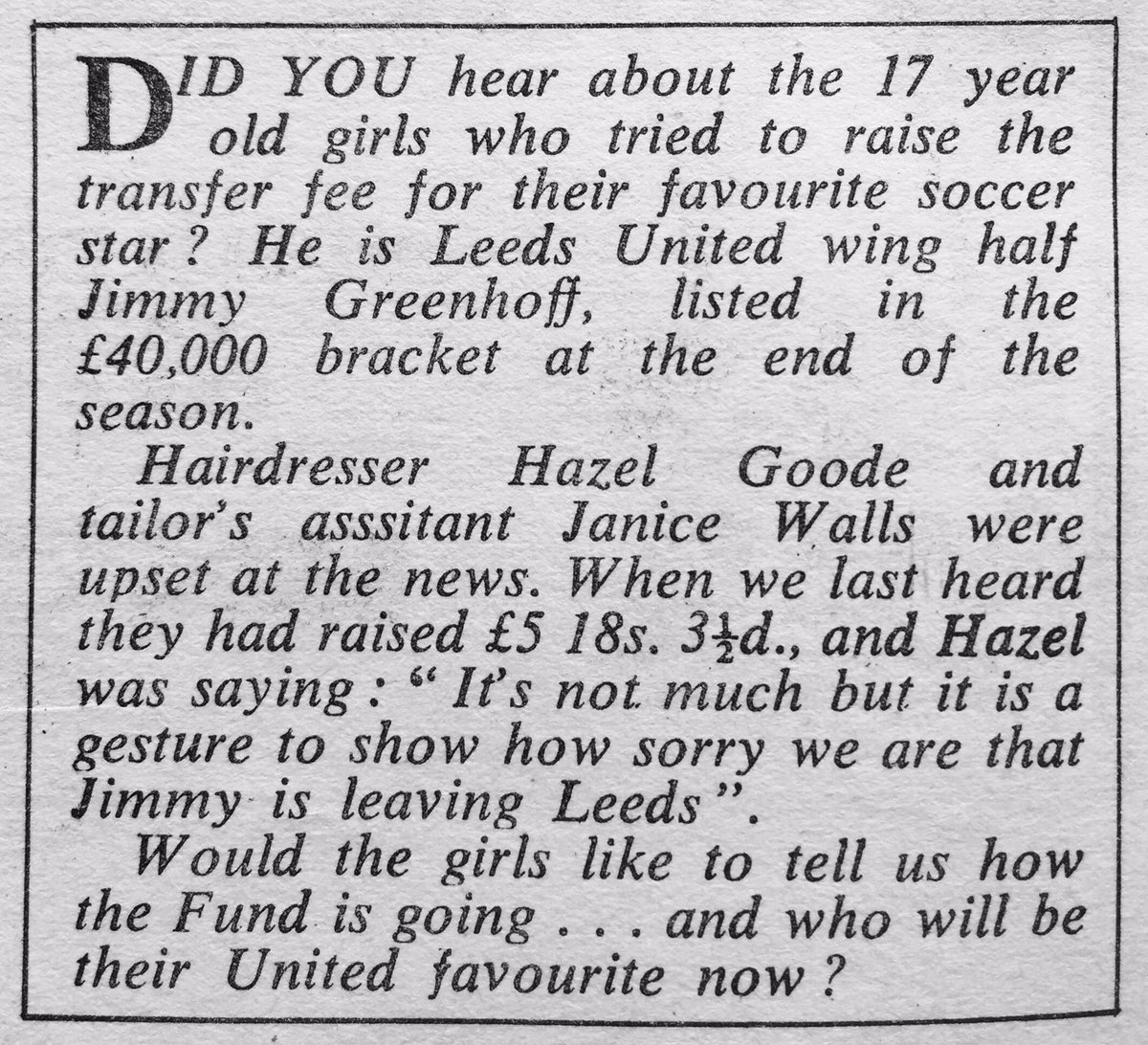 En morsom omtale av ham ble skrevet i en utgave av Soccer Review 21/8-1965. Et par tenåringsjenter markerte sin protest mot at Leeds ville selge Jimmy G for £ 40.000. De begynte å samle inn penger til denne summen for at han skulle bli i klubben. Kanskje det var grunnen til at han fortsatte helt frem til 1968 i Leeds.  ;)