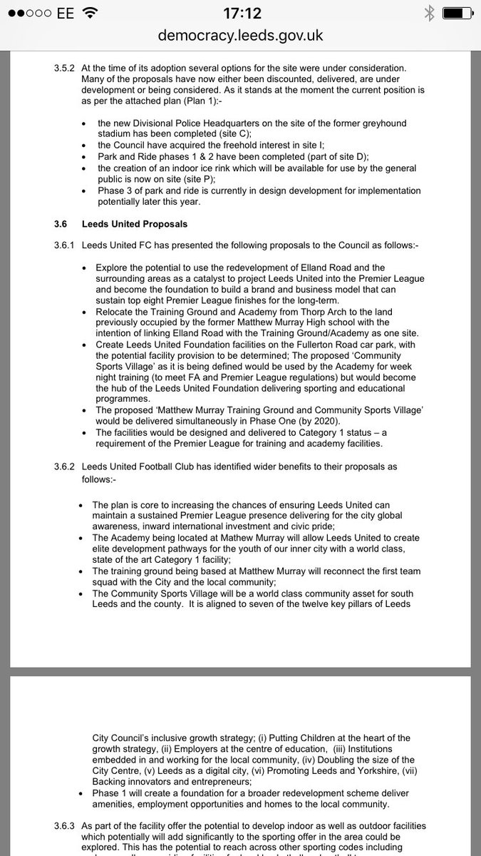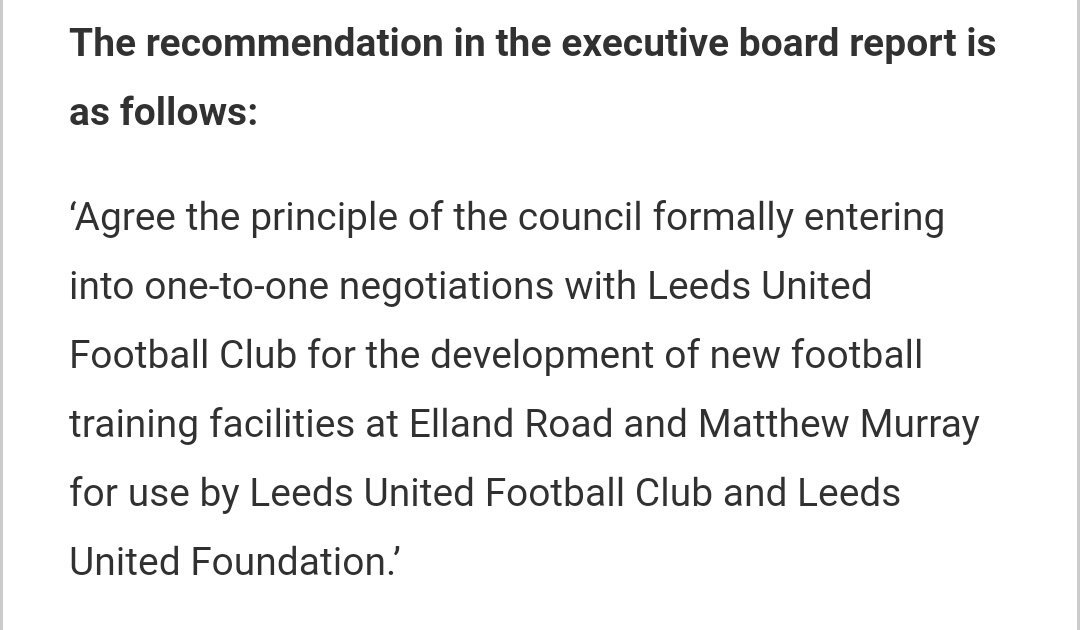 ‘Agree the principle of the council formally entering into one-to-one negotiations with Leeds United Football Club for the development of new football training facilities at Elland Road and Matthew Murray for use by Leeds United Football Club and Leeds United Foundation.’