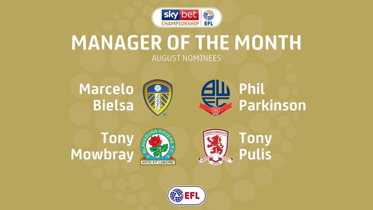 Leeds United manager Marcelo Bielsa has been named the Sky Bet Championship Manager of the Month for August.