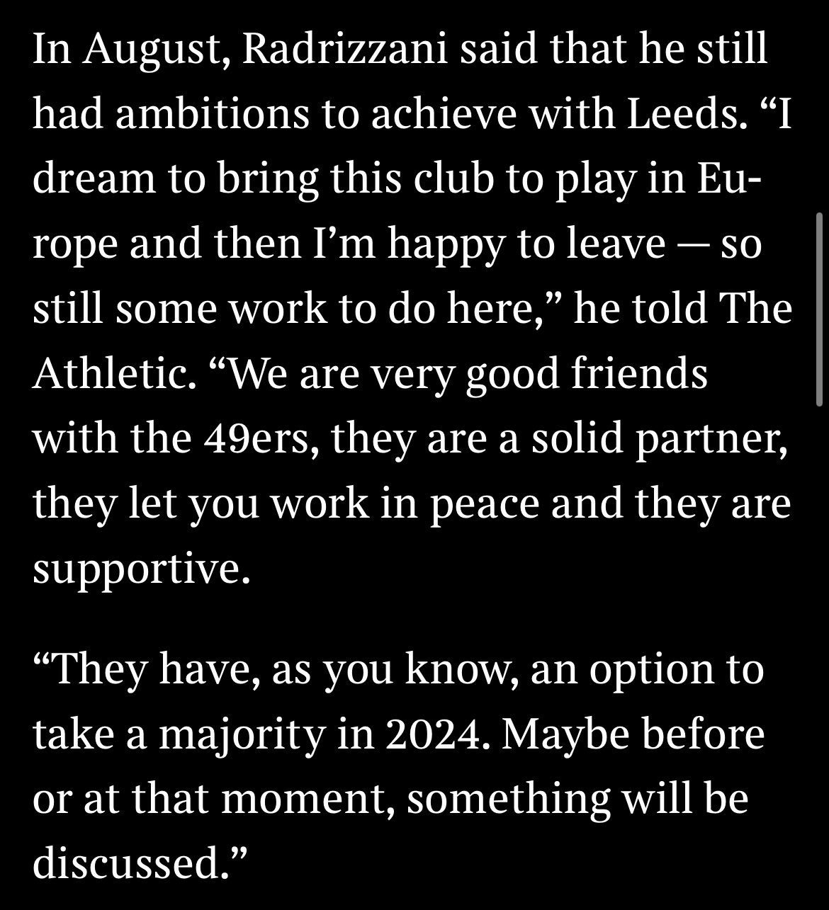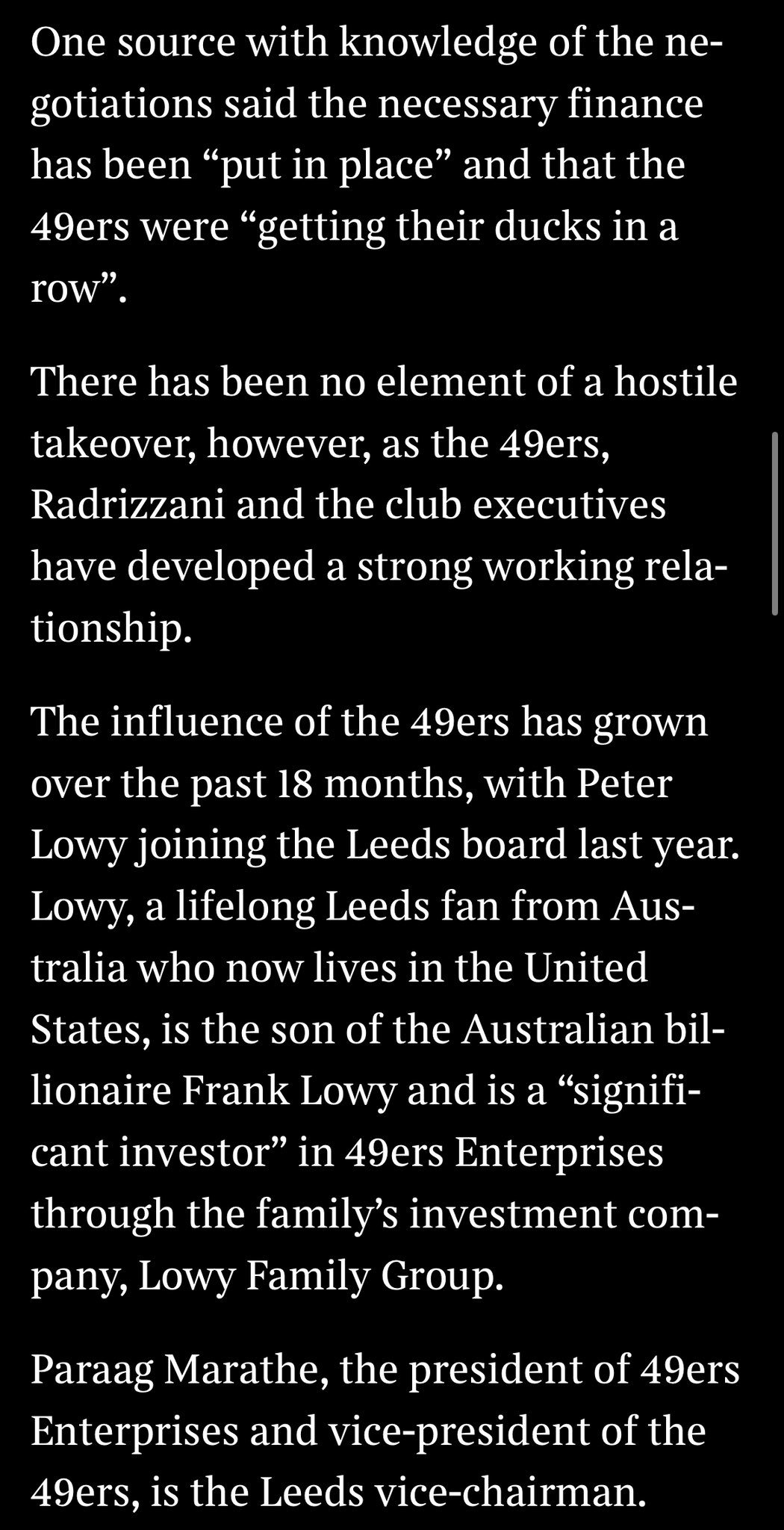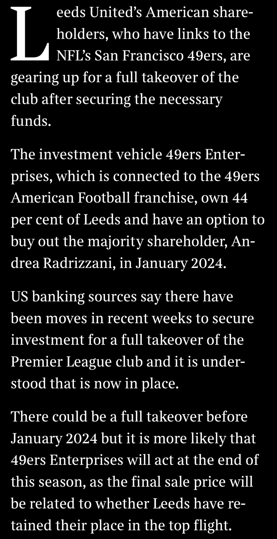 49ers Enterprises gearing up for full Leeds takeover - US banking sources say investment now in place. Have option to buy all shares in Jan 2024. story with