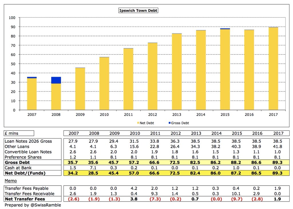 #ITFC gross debt increased by £2.7m from £86.6m to £89.3m. It has shot up from £36m when Evans bought the club in 2007. All the debt is owed to various Marcus Evans’ companies, through a mixture of loans, convertible loan notes and preference shares, so there is no external debt.