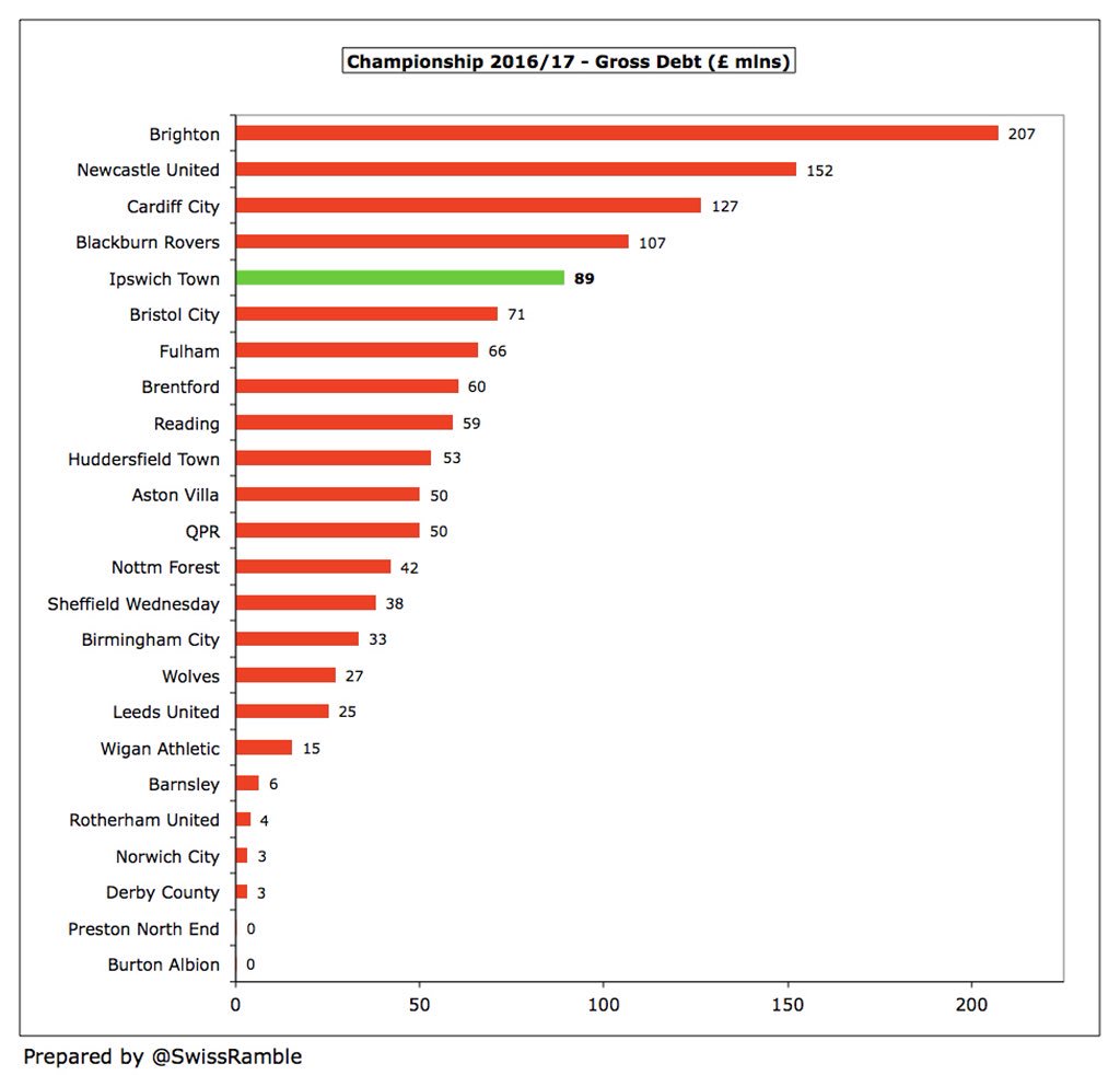 #ITFC £89m debt was the 5th highest in the Championship, below 3 clubs that have since been promoted to the Premier League (Brighton £207m, Newcastle £152m & Cardiff City £127m) plus Blackburn. Unlike many owners, Evans has not converted any debt into equity.