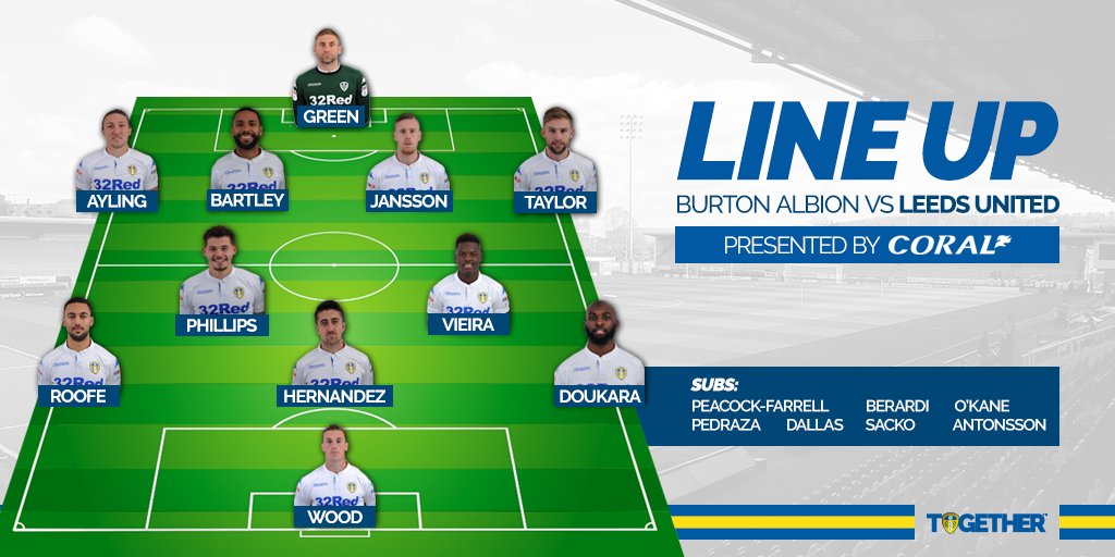 Green - Ayling, Bartley, Jansson, Berardi - Vieira, Bridcutt - Roofe, Hernandez, Doukara - Wood