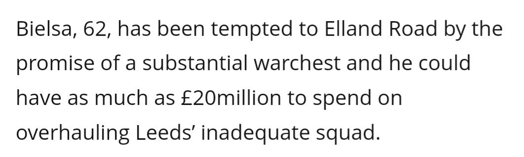Det er snakk om en warchest på 20 mill pund. 10 av disse får de vel inn fra investoren fra USA. Bielsa har en høy lønn, men i året er det jo "kun" 3,5 mill pund. Så det er ikke så veldig store summer som nå brukes. Men selvsagt mye mer enn hva vi er vant til. Også når man tar i betraktning at lønnsbudsjettet skal økes.