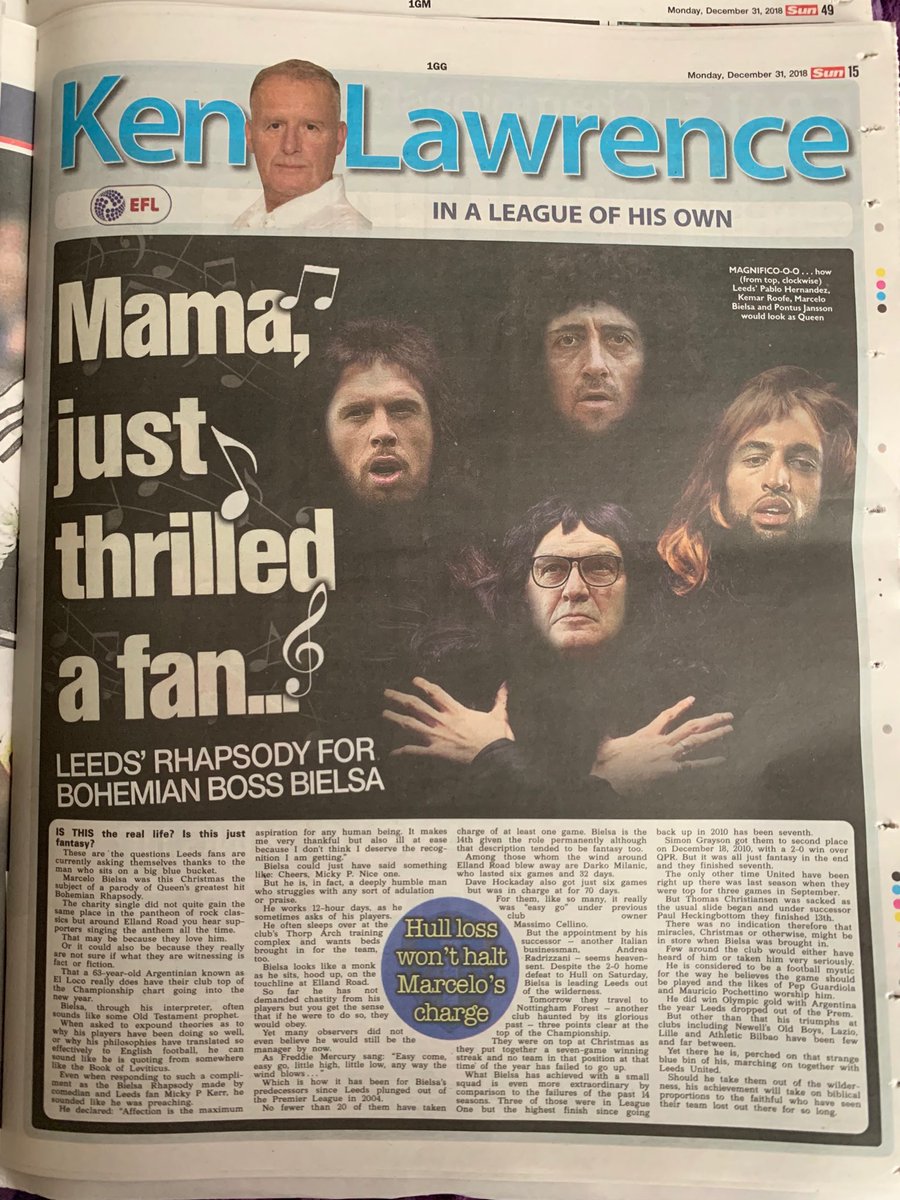 They love him for being a workaholic, obsessed with fitness. They love his revolutionary training methods, his humility on and off the pitch, his insistence that the length of the grass is perfect. They love Bielsa ball, where the players aggressively win the ball back, give their opponents no time to breathe and keep possession for long periods. They make videos of songs about blue buckets. They sing his name to the tune of the White Stripes’ Seven Nation Army and, most recently, a group of supporters released Bielsa’s Rhapsody, a magnificent adaptation of the Queen ditty.