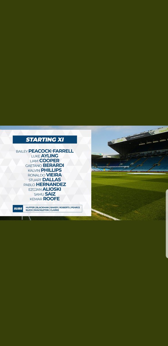 Peacock-Farrell, Ayling, Cooper (c), Berardi, Dallas, Phillips, Vieira, Alioski, Saiz, Hernandez, Roofe.