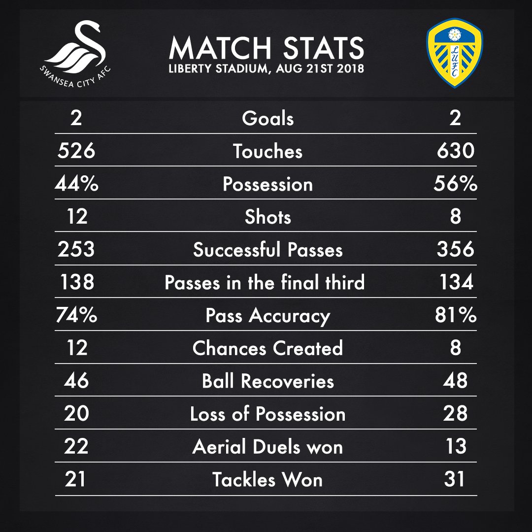 An open and entertaining clash at the Liberty Stadium saw Leeds enjoy more of the ball, but Swansea were more dangerous in the final third. Leeds' struggled to operate at the same intensity but battled well despite their fair share of defensive lapses. A valuable point.  #LUFC