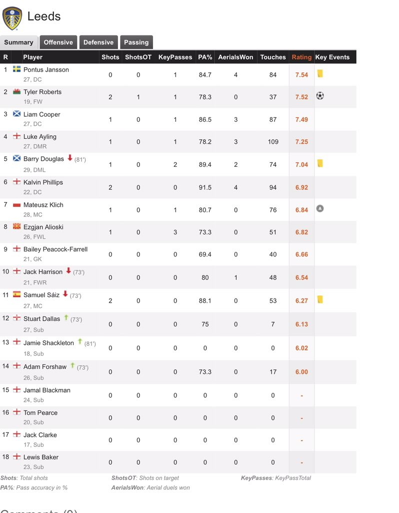 few stats from @WhoScored passing accuracy (phillips 91.5%), and match rating (Jansson MoM) #lufc whoscored.com/Matches/128883…