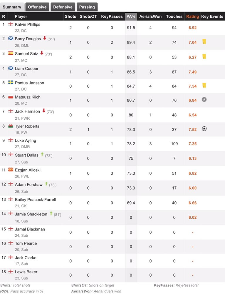 Ezgjan Alioski - Missed a great chance after 35mins when put through by Tyler Roberts’ flicked pass, sort of chance you have to take. Was wasteful with the ball all through the first half until just before half time when he exchanged passes with Saiz and got in behind down the right, his pull back was good but Barry Douglas got ahead of the ball and mis-hit the finish. Second half, not that involved, as usual, good when helping out defensively. Him and Harrison very similar overall today. 5.5/10
