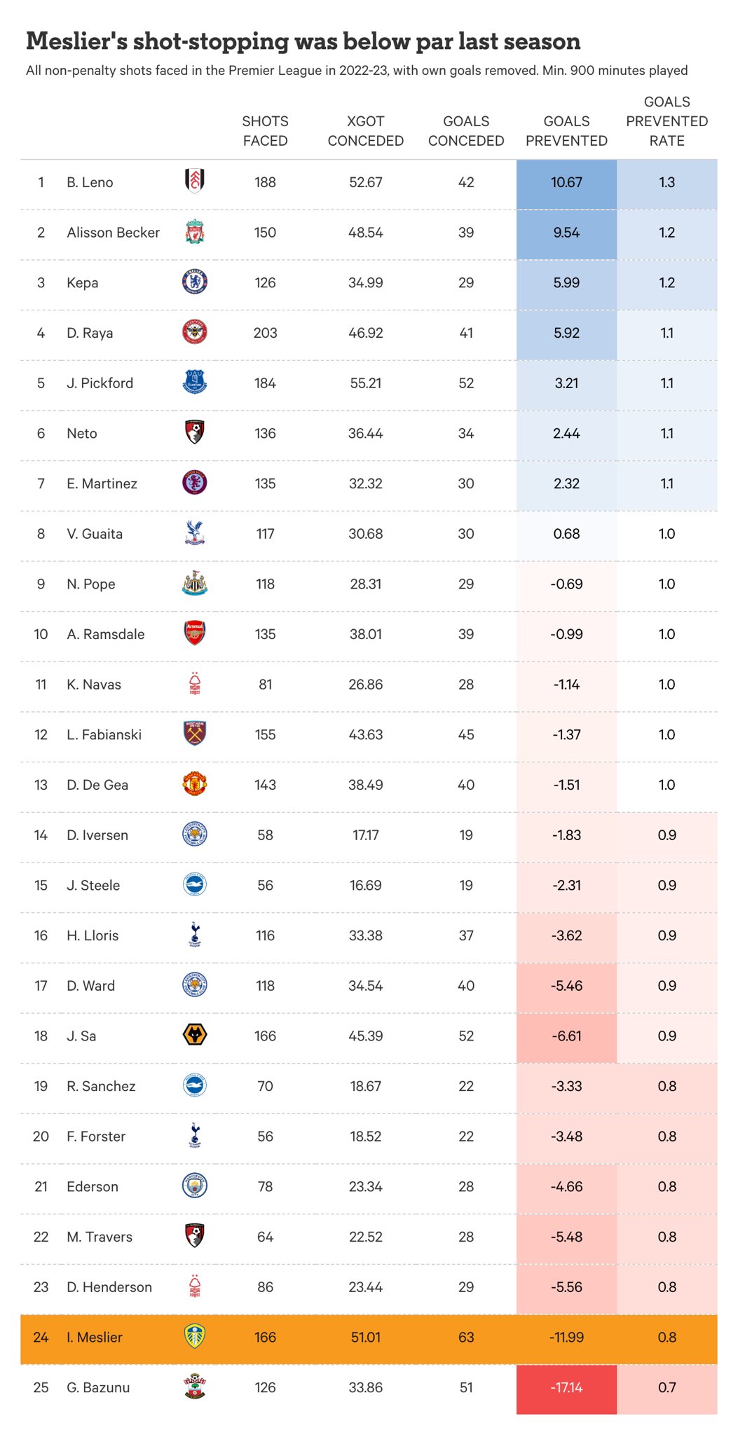 Over the 2022-23 campaign, Meslier was way below par. He conceded 63 goals (without including penalties) in 34 Premier League appearances, but his xGOT calculation indicated he should have shipped around 51, creating a negative difference of 12.