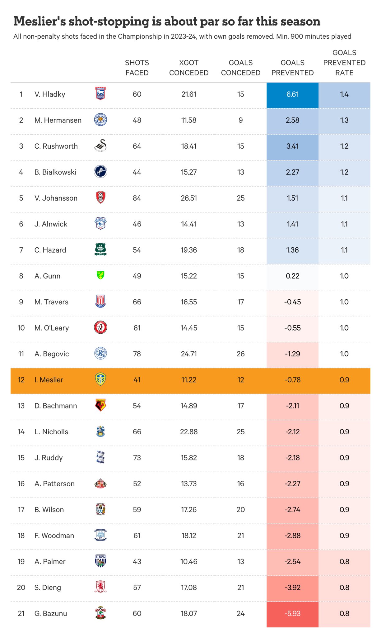 Anywho, det er for så vidt ikke poenget her. Det som er litt interessant å lese ut av statistikken, er at Leeds kun er slått av Leicester når det gjelder PSxG, med 13,4 mot 12,8. Leicester-keeperen har derimot en positiv forventet redning / forventet mål med 2,8. Så - basert på tallene alene - har altså dansken stoppet tre mål mer enn forventet, mens Meslier har sluppet inn et drøyt halvt mål mer enn han "burde". På "lagstatistikken" har Leicester en xGA på 14,3 og har sluppet inn 10 mål. Som det står forklart "either luck or above average performance" viser at Leicester så langt har stoppet noen flere forventede mål enn Leeds og tar man keeper-statistikken i betraktning, er mye av dette knyttet direkte til keeper.