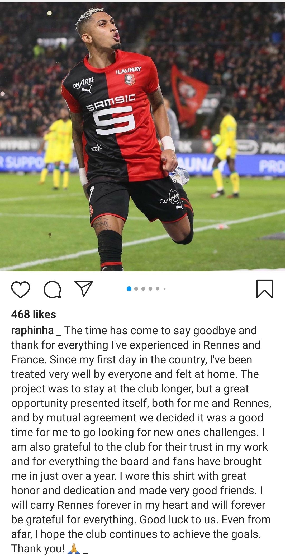 Raphinha's farewell message to Rennes. Should put an end to that 'against his wishes' suggestion that appeared yesterday.