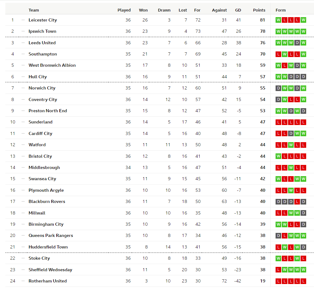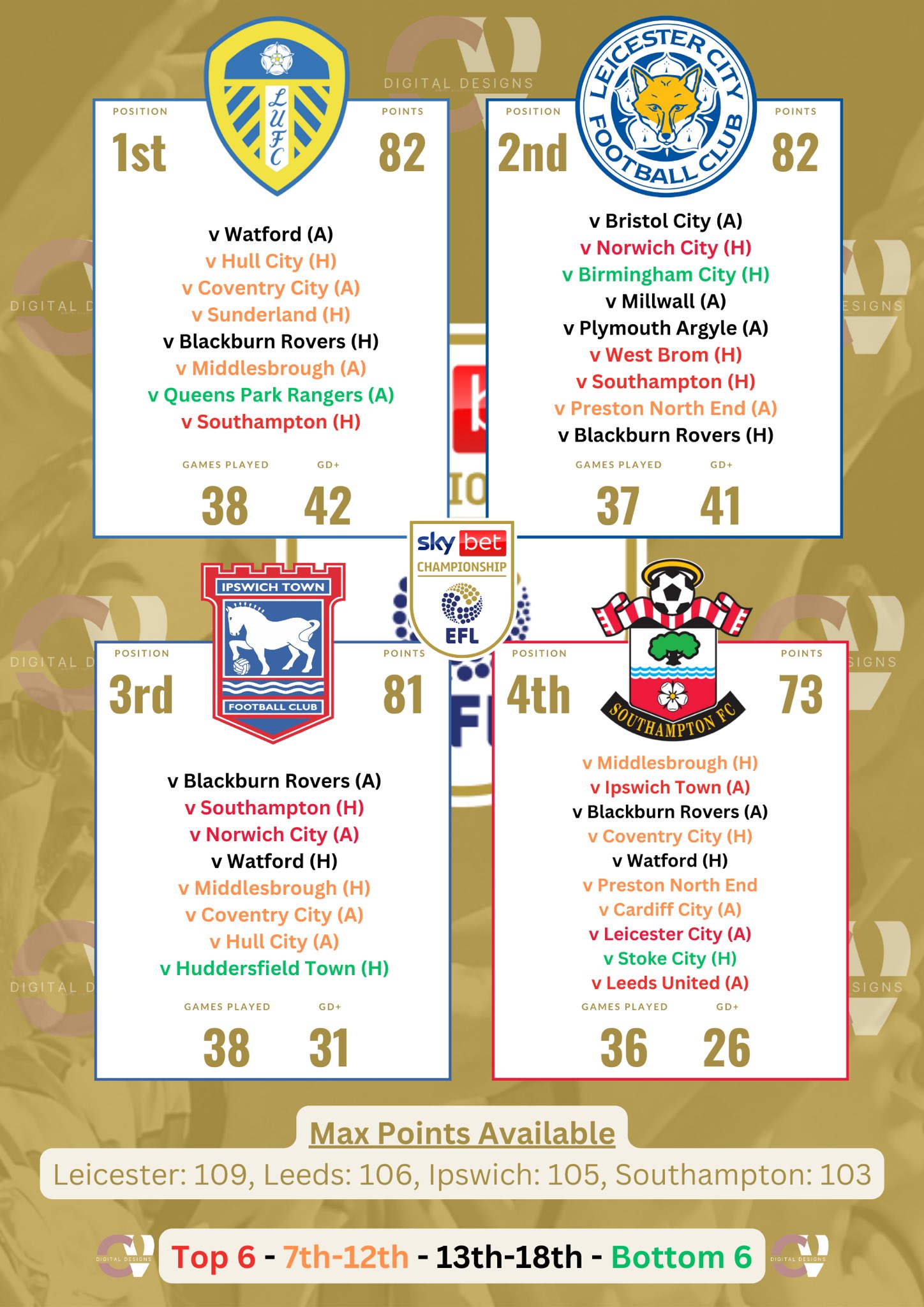 Ferdig med januar-februar, der jeg trodde Ipswich ville "sprekke". Det har ikke skjedd, men de er blitt innhentet med 5 poeng av Leeds og er nær 1. plass.
