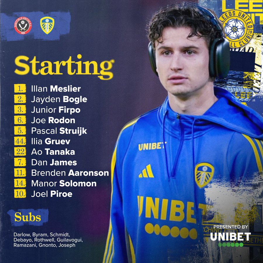 Meslier - Bogle, Rodon, Struijk, Firpo - Ampadu, Tanaka - James, Rothwell, Solomon - Piroe