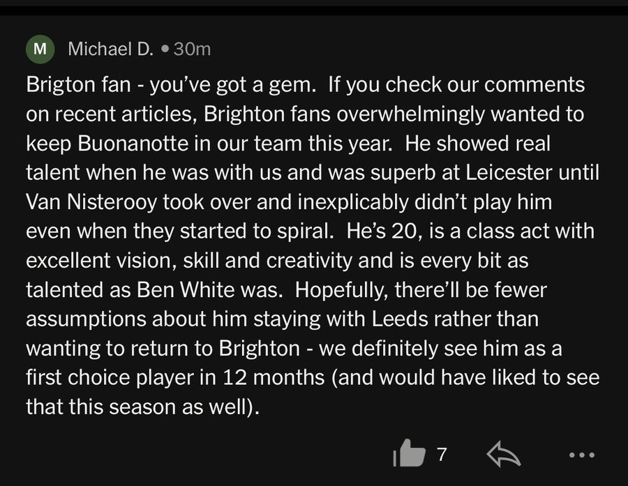 Brighton fan on the Athletic comments. A lot of their fans are very annoyed that they've let him go on loan again and wanted him as part of the first team squad. Looks like we've got ourselves a good little gem 💎🪄there for the season #lufc #Buonanotte