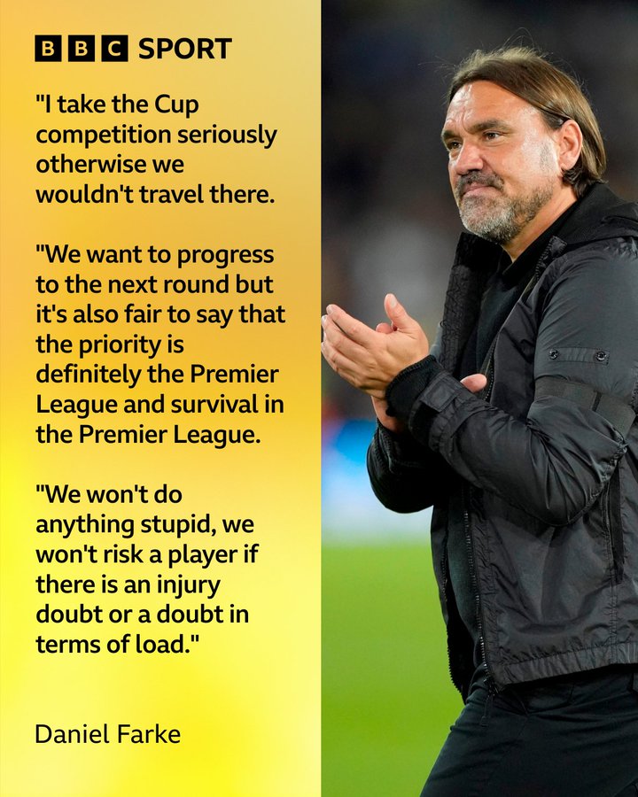 OK at Farke prioriterer å bruke cupkampen til å fokusere på den fysiske formen til de som ikke har spilt noe særlig. Da får vi nok se Bijol, Byram/Schmidt og Bornauw i forsvar, Longstaff på midten og kanskje Nmecha på topp?