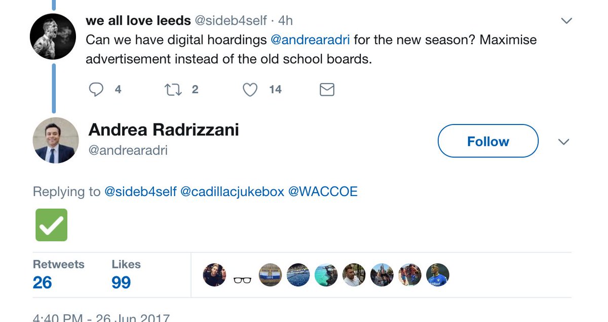 Ja spørsmålet er vel om Rad bør vurdere å få til en hovedsponsor på en ny stadion. Hvis han har så mange kontakter så er det jo nærliggende å tro at et eller annet globalt selskap kunne tenkt seg å bygget noe nytt. Helt uproblematisk for meg å hete for eksempel "Microsoft Leeds Stadium"  ;D ;D
